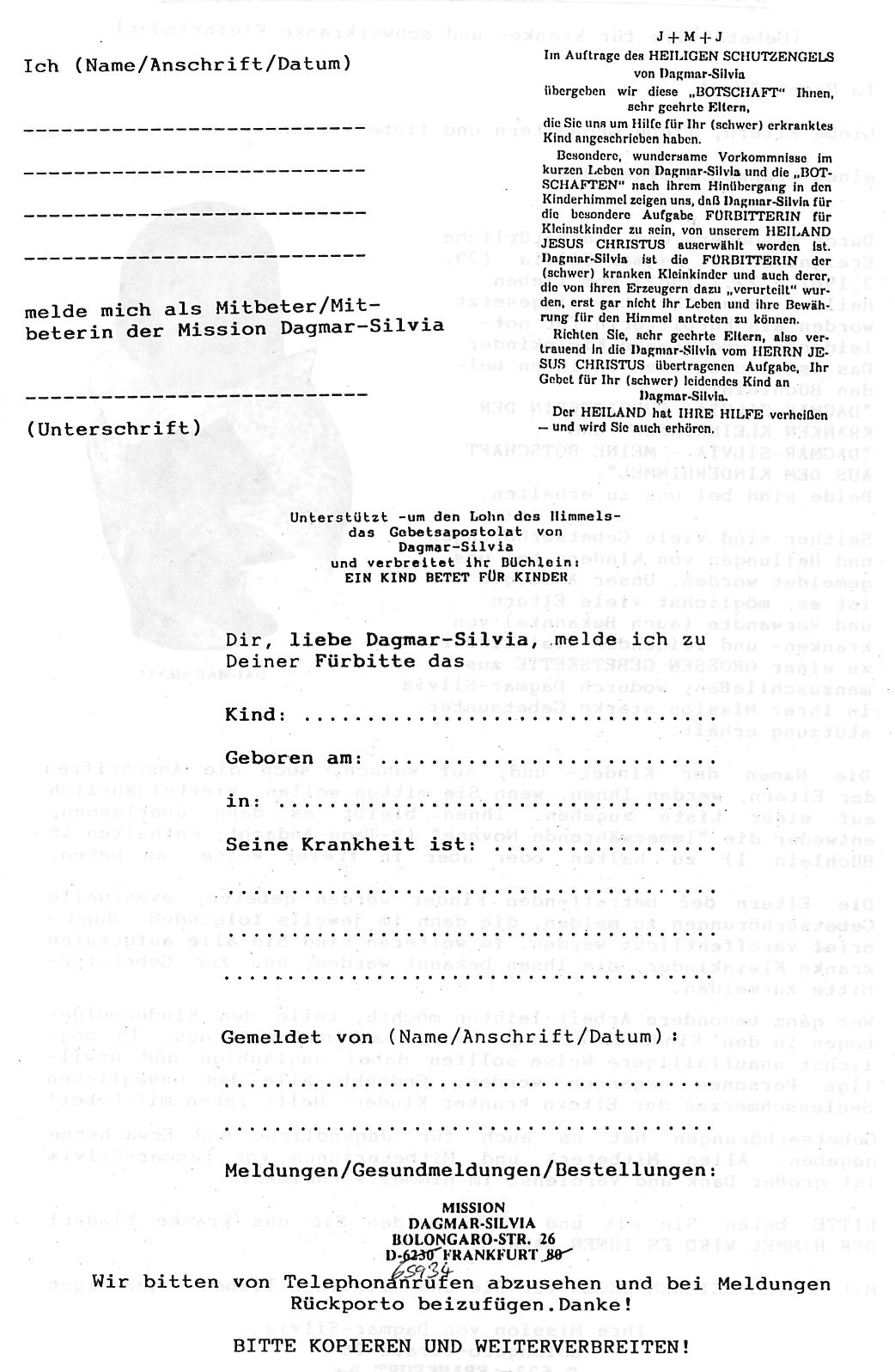 Senden Sie, sehr geehrte Eltern, Verwandte und Bekannte eines kranken Kindes, also, vertrauend auf die Dagmar – Silvia vom Herrn Jesus Christus übertragen wordenen Aufgabe, Ihren Hilferuf auch an Dagmar – Silvia, der Fürbitterin der kranken Kinder.